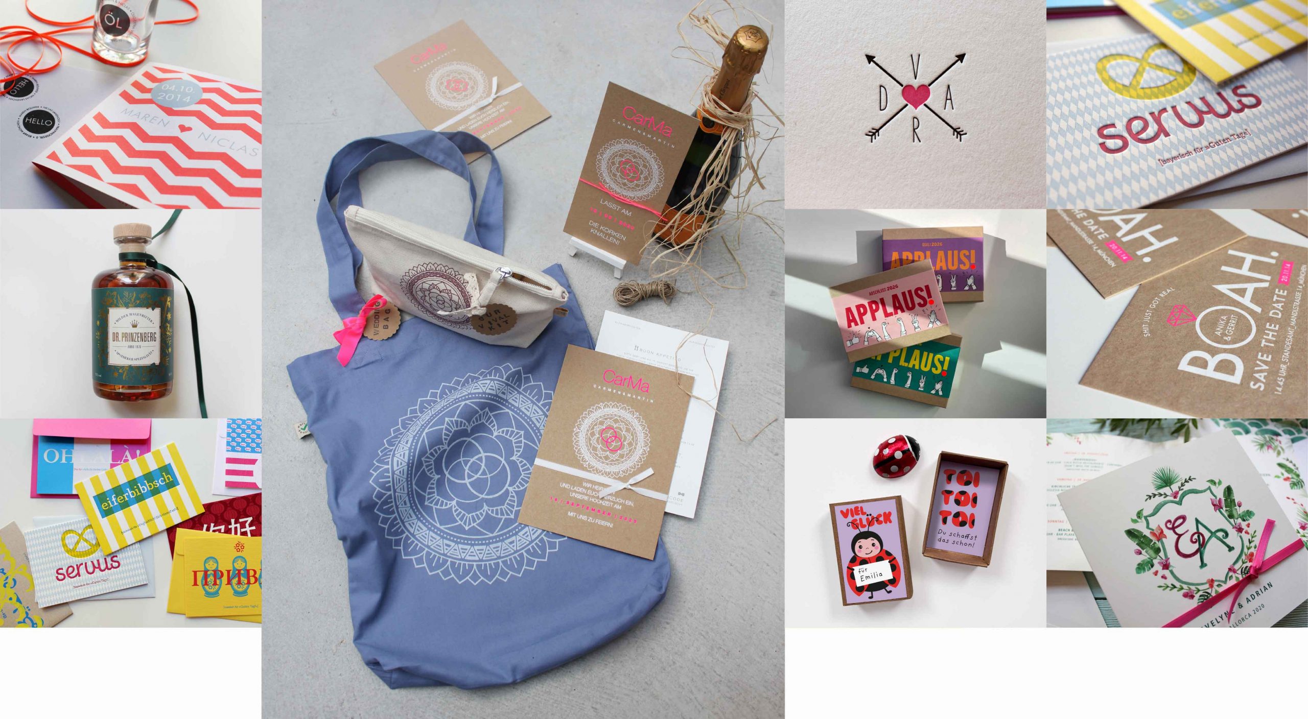 Neben der Gestaltung von individueller Hochzeitspapeterie biete ich persönliche Erscheinungsbilder für private Feste und Firmenfeiern an. So bekommen Geburtstage, Jubiläen, Tauf-Feiern und andere besondere Ereignisse einen perfekt gestalteten Rahmen. Von der Einladungskarte bis zur Danksagung wird die Papeterie Eures Festes nach Euren Wünschen entwickelt. Einfache Klappkarten oder Hefte mit ausführlichen Texten und Lageplänen, sowie verschiedene Veredelungstechniken im Druck, wie Prägungen und Stanzungen oder Letterpress und Siebdruck werden nach Kundenwunsch erstellt – immer mit Herz und viel Liebe zum Detail!