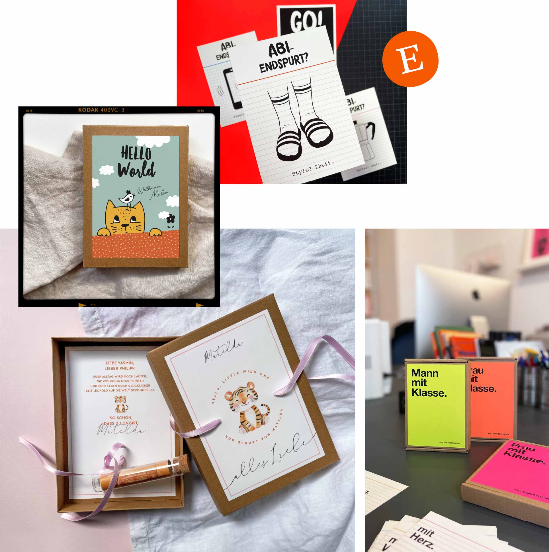 Gästebücher, Geschenkverpackungen, Glückwunschkarten, Willkommensposter, Bierdeckel, Freundebücher, Weihnachtskarten und vieles, vieles mehr …